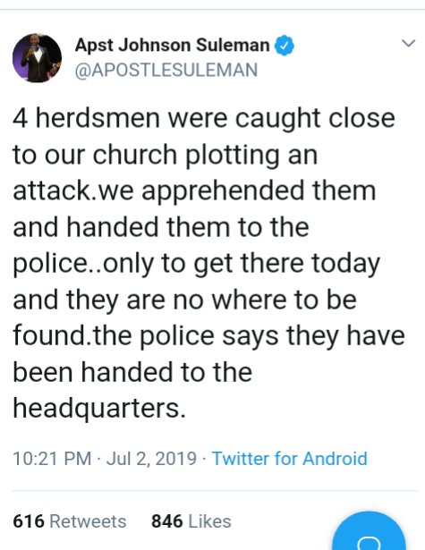 “4 herdsmen were caught close to our church plotting an attack. We apprehended them and handed them to the police..only to get there today and they are no where to be found. The police says they have been handed to the headquarters,” he said.