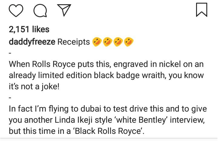 OAP Daddy Freeze has shared receipts to prove Hushpuppi really owns the Black Badge Rolls Royce he claimed as his.