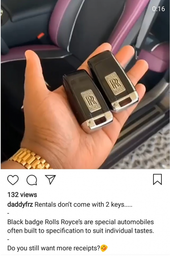 First, Freeze shared a photo of Huspuppi’s name engraved in the Black Badge Wraithe and said Rolls Royce would never put his name there if he hadn’t acquired it. Freeze also shared two car keys that came with the car and pointed out that rented cars only come with one key.