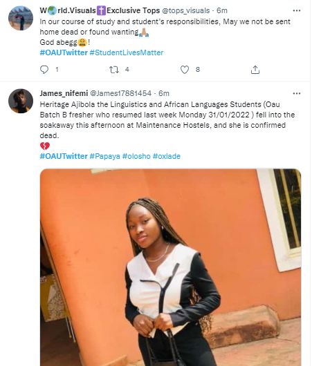 ”Heritage Ajibola, the Linguistics and African Languages student who accidentally fell into the soakaway this afternoon at Bver Hostel, Maintenance Hostels, is confirmed dead!