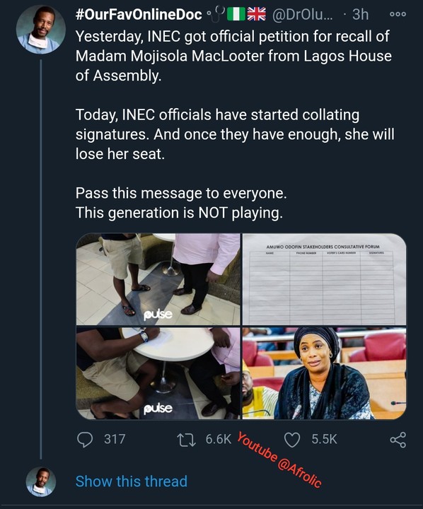 According to Pulse, field officers have commenced a door-to-door campaign to gather enough signatures to officially commence the recall of Mojisola Alli-Macaulay from the Lagos House of Assembly.