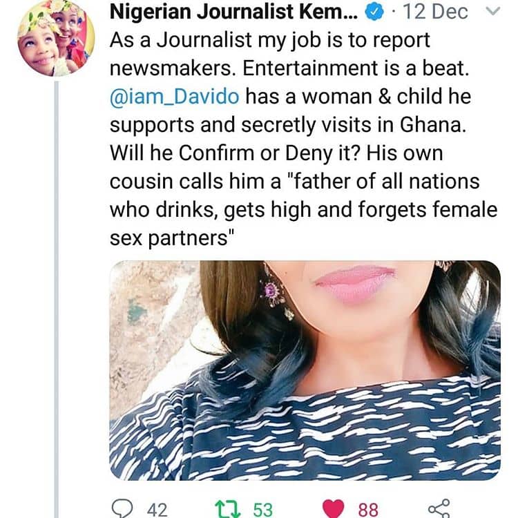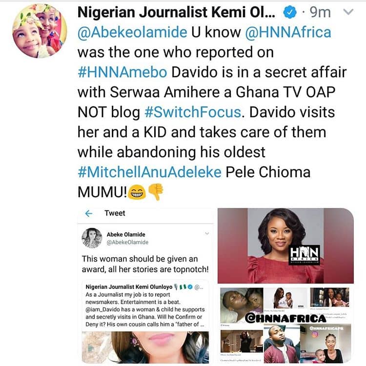 “I’m an investigative Journalist. Combine that with gossip news you have #HNNAmebo.@hnnafrica was the one who FIRST reported on Davido being in a secret affair with #SerwaaAmihere a Ghana TV OAP NOT blog #SwitchFocus.