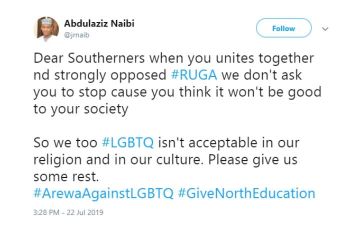 Joining the campaign against the LGBTQ community by Arewa members, Abdulaziz Naibi, tweeted;