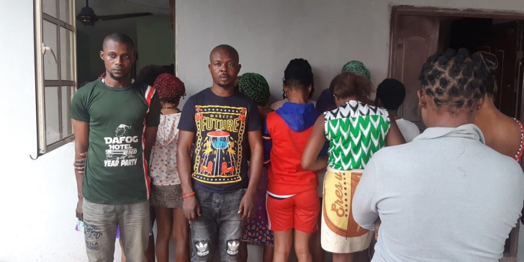 Two men were arrested alongside 14 girls said to come from Akwa Ibom, Kogi, Enugu and Imo states. The girls who claimed they were lured to the facility by friends from their respective villages are forced to pay their boss N1,000 daily for the accommodation, and they are forced to sleep with a minimum of four men daily at a fee ranging between N500 and N1,000 per client to achieve this. Asides sleeping with clients for money, it was also learnt that the men also slept with them any time they want.