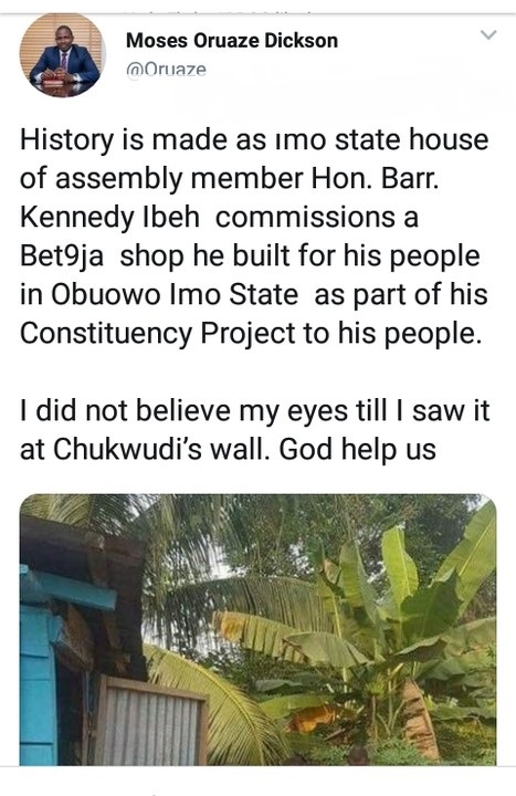 Imo State House of assembly member Hon. Barr. Kennedy Ibeh representing Obuow State constituency. Commissioned a betting shop he built for his people as part of his project