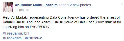 According to Abubakar Aminu Ibrahim, a House of Representatives member, Hon. Ali Madaki representing Dala Constituency in Kano State allegedly ordered the arrest of Kamalu Salisu Jibril and Adamu Salisu Yalwa from Dala Local Government for criticizing him on Facebook.