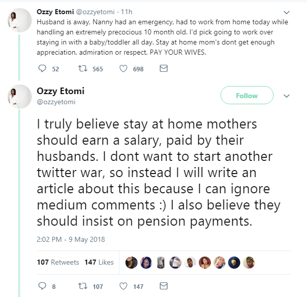 I truly believe stay at home mothers should earn a salary, paid by their husbands. I dont want to start another twitter war, so instead I will write an article about this because I can ignore medium comments