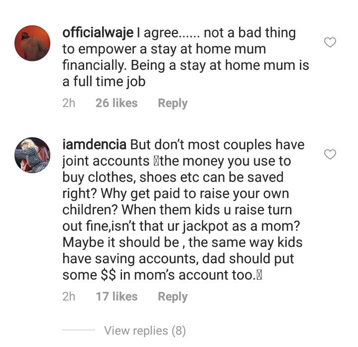 “But don’t most couples have joint accounts the money you use to buy clothes, shoes etc can be saved right? Why get paid to raise your own children? When them kids u raise turn out fine,isn’t that ur jackpot as a mom? Maybe it should be , the same way kids have saving accounts, dad should put some $$ in mom’s account too.”