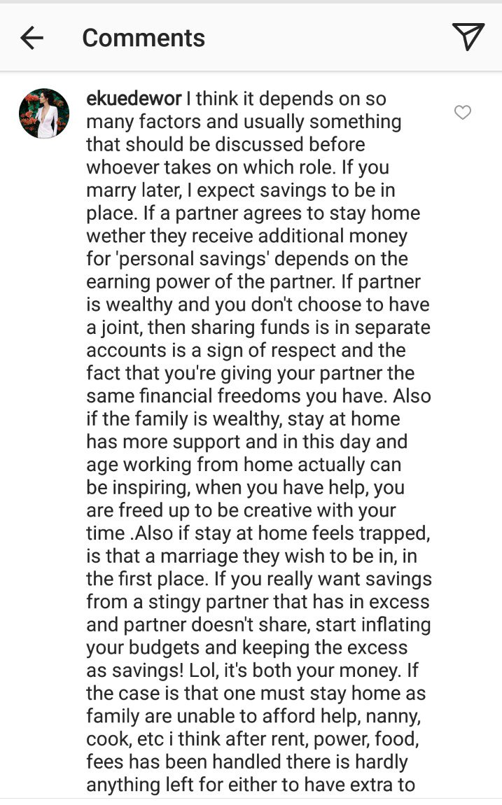 “I think it depends on so many factors and usually something that should be discussed before whoever takes on which role. If you marry later, I expect savings to be in place. If a partner agrees to stay home wether they receive additional money for ‘personal savings’ depends on the earning power of the partner. If partner is wealthy and you don’t choose to have a joint, then sharing funds is in separate accounts is a sign of respect and the fact that you’re giving your partner the same financial freedoms you have. Also if the family is wealthy, stay at home has more support and in this day and age working from home actually can be inspiring, when you have help, you are freed up to be creative with your time .Also if stay at home feels trapped, is that a marriage they wish to be in, in the first place. If you really want savings from a stingy partner that has in excess and partner doesn’t share, start inflating your budgets and keeping the excess as savings! Lol, it’s both your money. If the case is that one must stay home as family are unable to afford help, nanny, cook, etc i think after rent, power, food, fees has been handled there is hardly anything left for either to have extra to save but rather all extra should be saved for the benefit of family in long run. So many factors to consider really and so many diff examples but it’s all choice at the end of the day.”