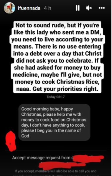 Former Big Brother Naija housemate, Ifu Ennada has chided a follower who begged her for money to cook on Christmas day.