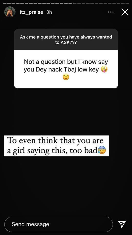 Praise, the Big Brother Naija star, has replied a follower who accused him of sleeping with co-reality show star, Tolanibaj.