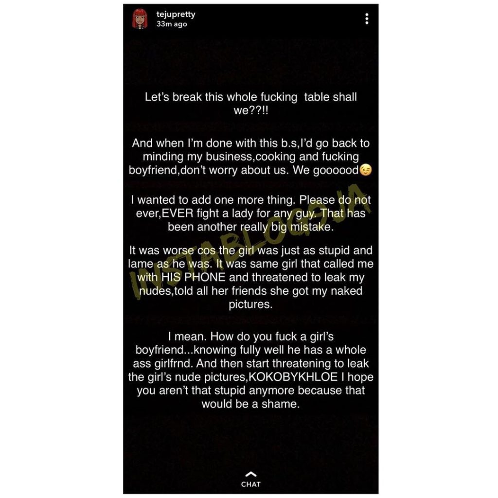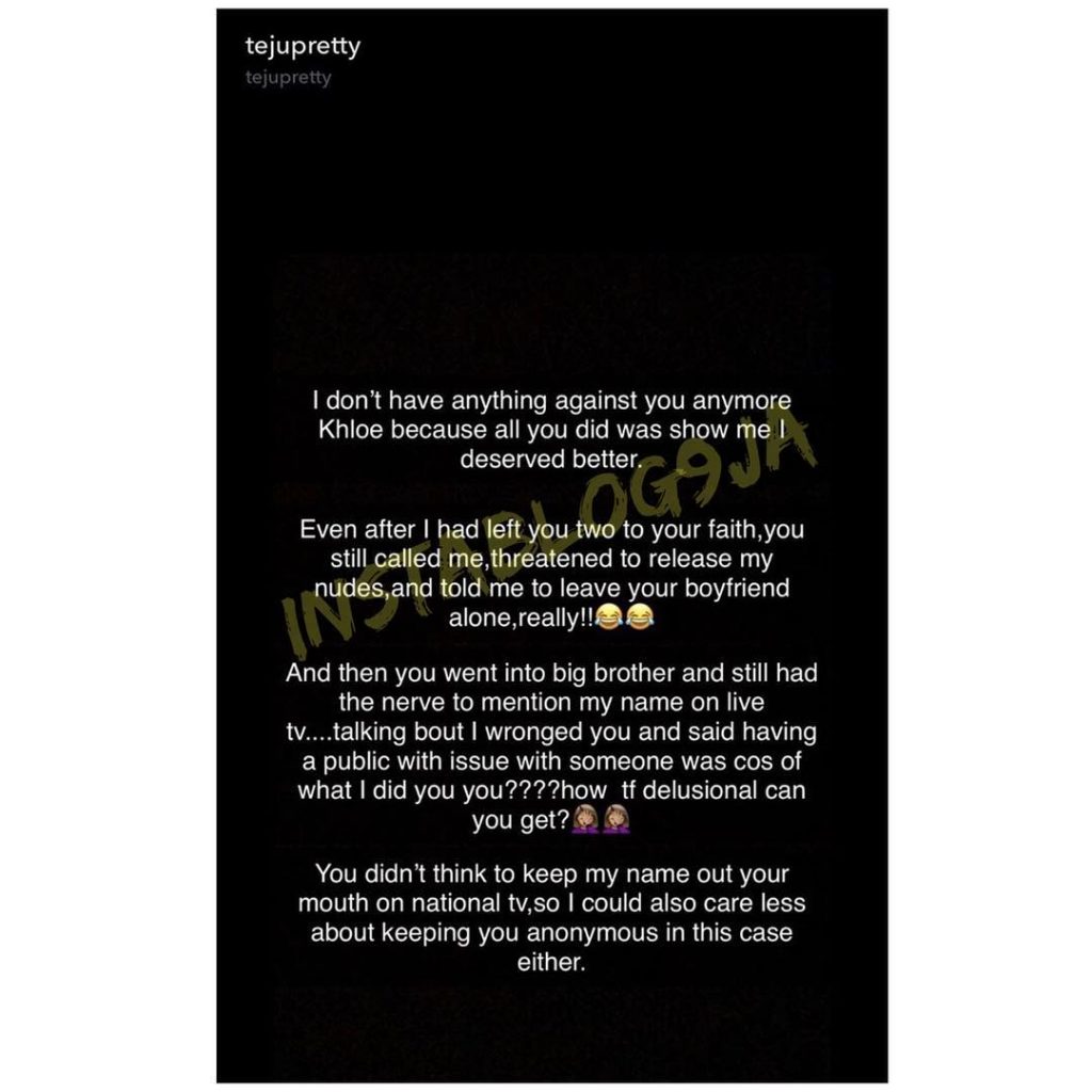 Fashionista #Teju Pretty accuses BBN’s #Khloe for once blackmailing her with nudes over their mutual boyfriend, Mr Ye.