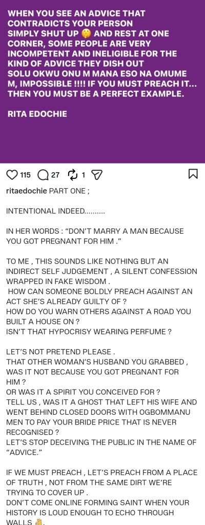Nollywood actress,Rita Edochie has called out her husband’s nephew, Yul Edochie’s second wife, Judy Austin over a recent advice she gave to young women.