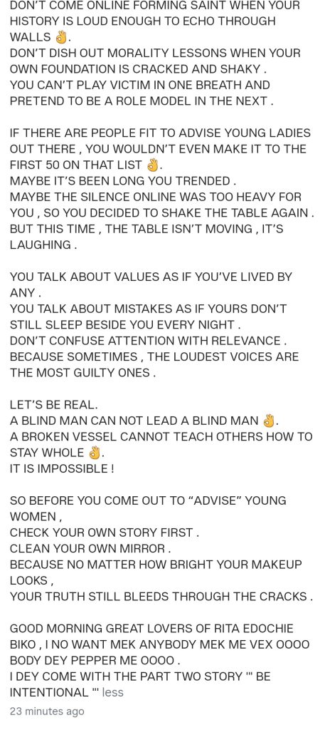 “SO BEFORE YOU COME OUT TO ‘ADVISE’ YOUNG WOMEN , CHECK YOUR OWN STORY FIRST . CLEAN YOUR OWN MIRROR . BECAUSE NO MATTER HOW BRIGHT YOUR MAKEUP LOOKS , YOUR TRUTH STILL BLEEDS THROUGH THE CRACKS .