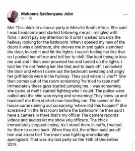 Jobo wrote; ‘‘Met This chick at a house party in Melville South Africa. She said I was handsome and started following me as I mingled with folks. I didn’t pay any attention to it until I walked towards the hallway looking for the bathroom.