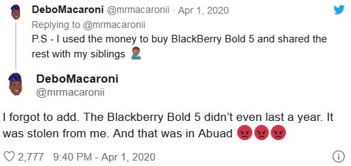 “P.S – I used the money to buy BlackBerry Bold 5 and shared the rest with my siblings… I forgot to add. The Blackberry Bold 5didn’t even last a year. It was stolen from me. And that was in Abuad“
