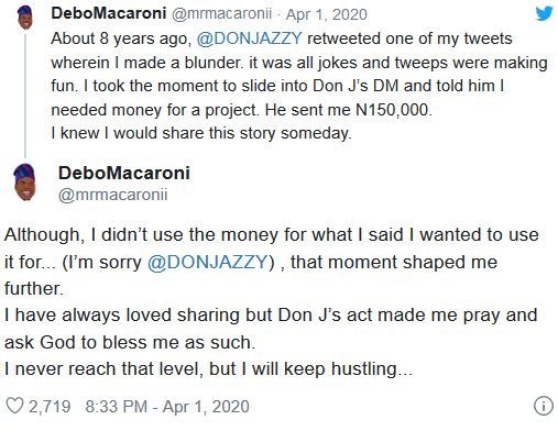 He wrote on Twitter: “About 8 years ago, @DONJAZZY retweeted one of my tweets wherein I made a blunder. it was all jokes and tweeps were making fun. I took the moment to slide into Don J’s DM and told him I needed money for a project. He sent me N150,000. I knew I would share this story someday.