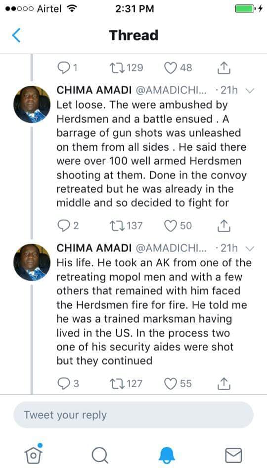 Let loose. They were ambushed by Herdsmen and a battle ensued. A barrage of gunshots was unleashed on them from all sides. He said there were over 100 well-armed Herdsmen shooting at them. Done in the convoy retreated but he was already in the middle and so decided to fight for