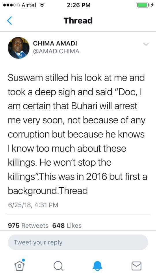 Suswam stilled his look at me and took a deep sigh and said “Doc, I am certain that Buhari will arrest me very soon, not because of any corruption but because he knows I know too much about these killings. He won’t stop the killings”.This was in 2016 but first a background. Thread