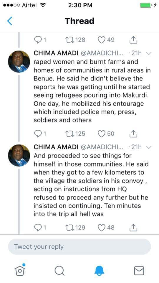 And started surfing the net for any information on ongoing killings in the Benue. True to what she told me, information was scanty with only untrustworthy blogs and citizen reporters alluding to anything of the sorts. The Benue state Gov Ortom himself was singing the praises of