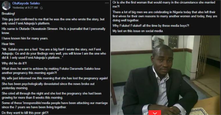 The husband of Nollywood figure, Foluke Daramola who has been identified as Olukayode Salako, has taken to social media to call out a Nigerian journalist identified as Olutade Oluwatosin Simeon.