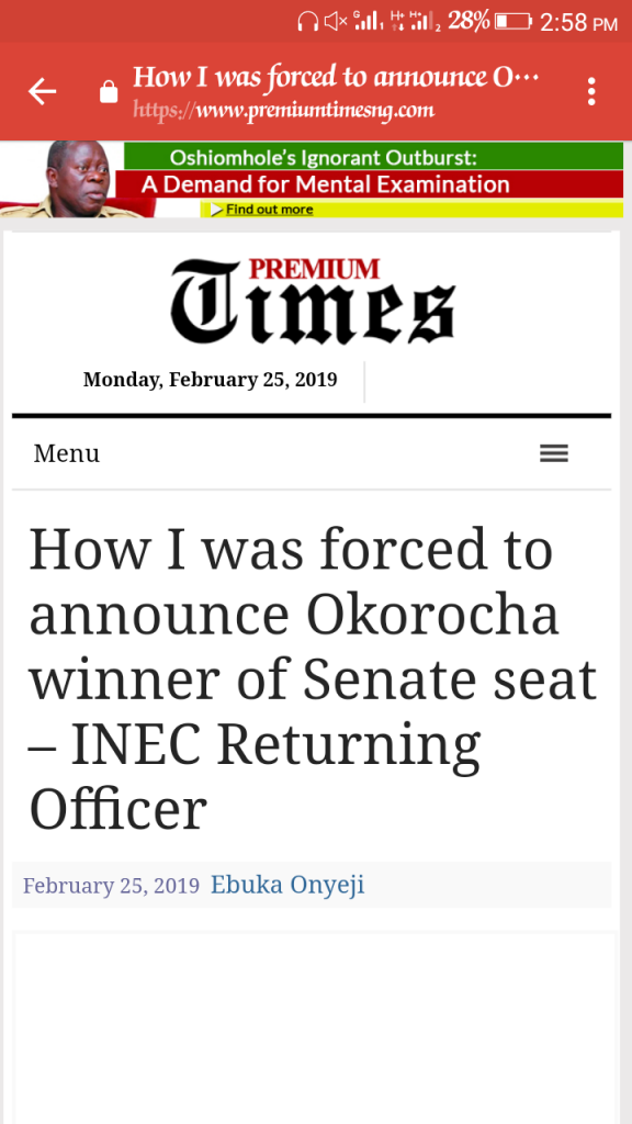 “My name is Ibeabuchi Izuchukwu Innocent, a professor at the Federal University of Technology Owerri (FUTO), the returning officer for Imo West (Orlu) senatorial zone”, the official said.