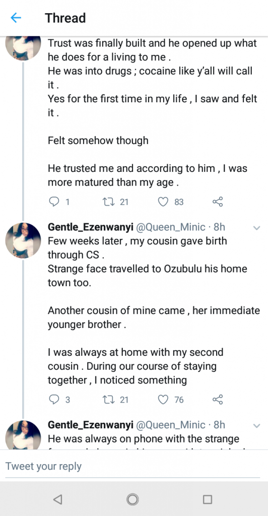 A Nigeria lady went on twitter to lament how her cousin she trusted molested her and her family forced her to keep quiet in order to protect the family name and drug business…