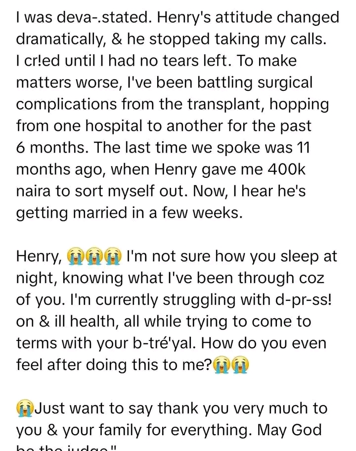 A heartbroken lady shares her devastating experience of betrayal by her ex, following a successful kidney transplant.