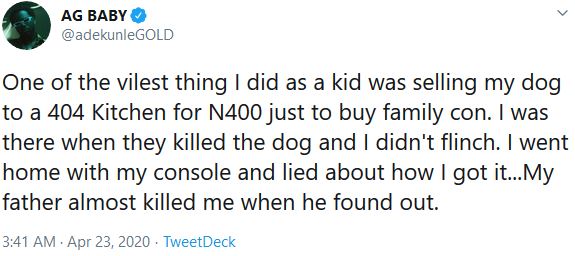 “One of the vilest thing I did as a kid was selling my dog to a 404 Kitchen for N400 just to buy family con. I was there when they killed the dog and I didn’t flinch. I went home with my console and lied about how I got it…My father almost killed me when he found out,” he wrote.