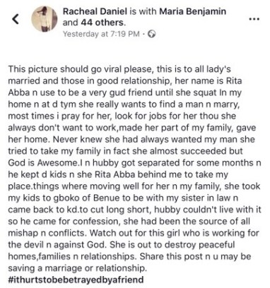 A Nigerian woman on Facebook as Rachel Daniel has taken to the social media platform to out a lady who happened to be her best friend, after the she tried to put an end to her matrimonial home.