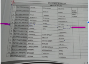 Snapshot from the convocation booklet shows Rosemary Keccy Busari as the first-class student