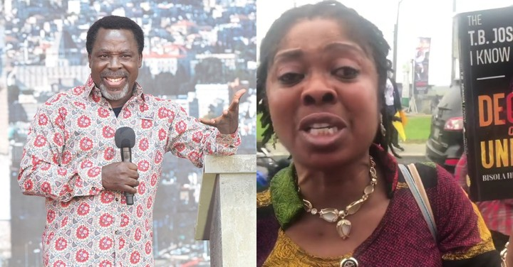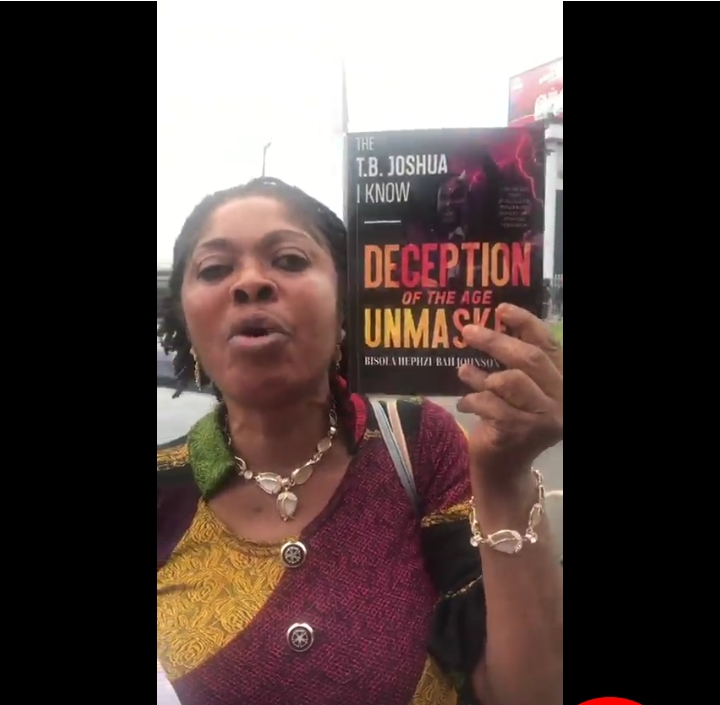 However, the woman, who was on a protest in support of Busola, made claims that Prophet T.B Joshua trapped her in his church for 14 years and raped her. She showed a book which she claimed contained evidence against the cleric in case he denied.