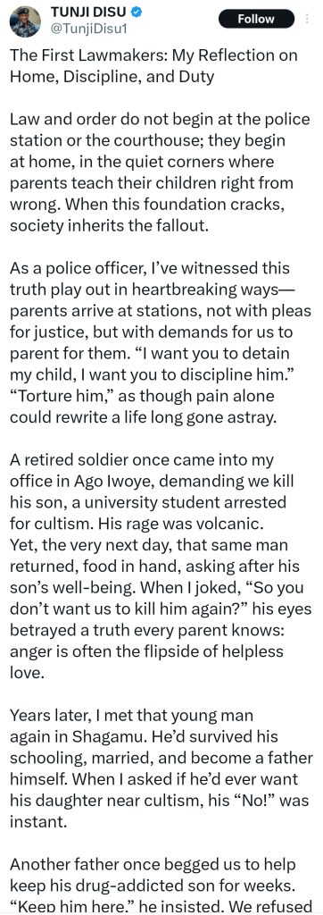 “A retired soldier once came into my office in Ago Iwoye, demanding we kill his son, a university student arrested for cultism. His rage was volcanic. Yet, the very next day, that same man returned, food in hand, asking after his son’s well-being. When I joked, ‘So you don’t want us to kill him again?’ his eyes betrayed a truth every parent knows: anger is often the flipside of helpless love,” he wrote.