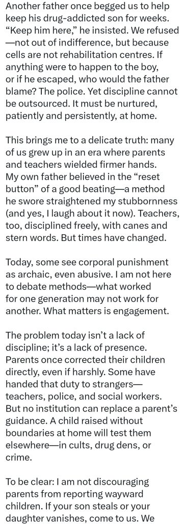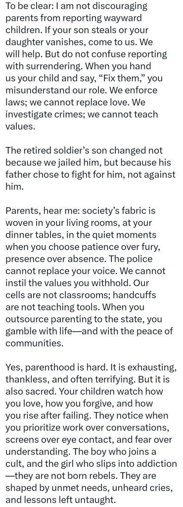 “To be clear: I am not discouraging parents from reporting wayward children. If your son steals or your daughter vanishes, come to us. We will help. But do not confuse reporting with surrendering. When you hand us your child and say, ‘Fix them,’ you misunderstand our role. We enforce laws; we cannot replace love. We investigate crimes; we cannot teach values.”