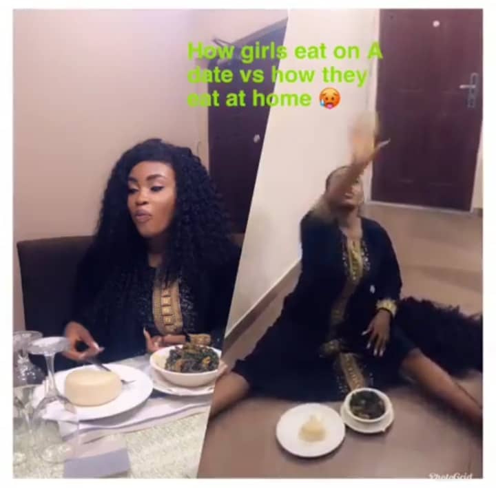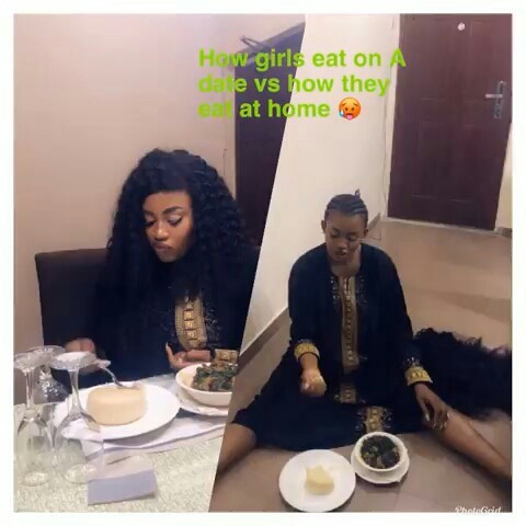 A Slay Queen has depicted how babes eat when they go on a date with a guy and how they eat when they are at home.
