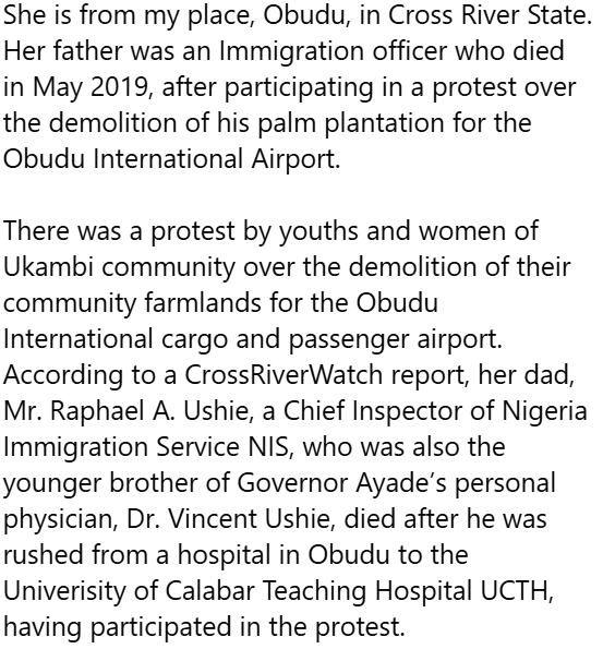 “She’s from my hometown, Obudu, in Cross River state. Her father, an immigration officer, died in May 2019 after taking part in a protest against the demolition of his palm plantation for the Obudu International Airport.