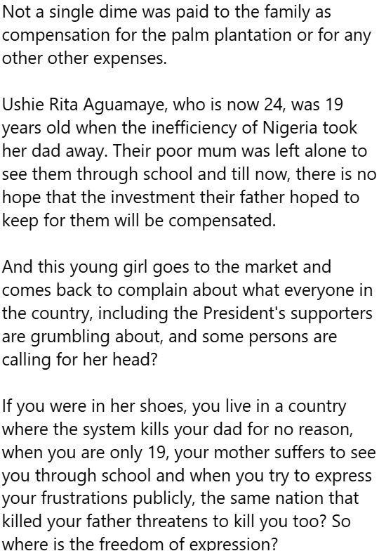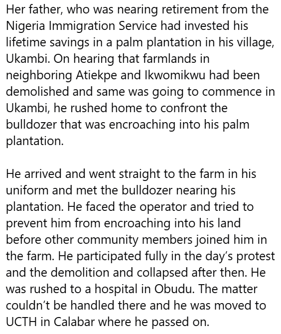 “Her father, who was nearing retirement, had spent his lifetime savings developing a palm plantation in his village, Ukambi. Upon learning that farmlands in neighboring Atiekpe and Ikwomikwu had been demolished and that Ukambi was next, he rushed home to confront the bulldozer encroaching on his land.”