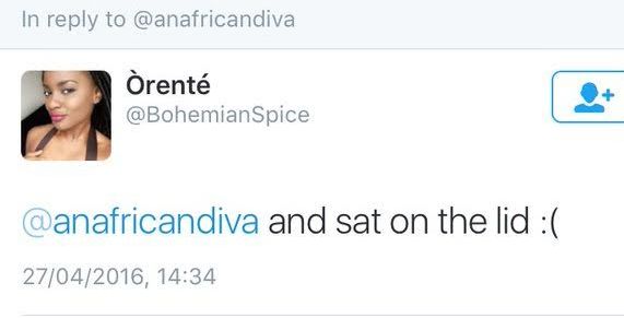 Read the rest of the conversation after the cut…she sat on a lid? Lol…