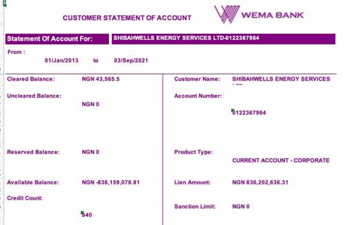 “To determine whether fraud or money laundering has occurred by these established facts, the account officer of Shibahwells in WEMA Bank PLC., one Kingsley Ananwede ‘m’ was invited and questioned. It was established that he worked in concert with other staff of WEMA Bank who are at large and the MD/CEO of Shibahwells Energy Limited to carry out the fraudulent activities on the accounts.