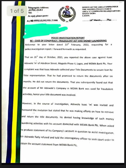 A police report exclusively obtained by SaharaReporters also indicted the bank and Adewole.