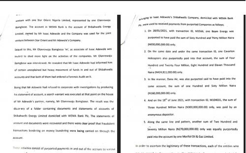 “To determine whether fraud or money laundering has occurred by these established facts, the account officer of Shibahwells in WEMA Bank PLC., one Kingsley Ananwede ‘m’ was invited and questioned. It was established that he worked in concert with other staff of WEMA Bank who are at large and the MD/CEO of Shibahwells Energy Limited to carry out the fraudulent activities on the accounts.
