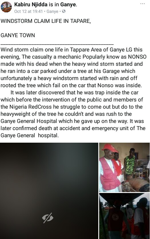 According to Comrade Kabiru Njidda, a facilitator at Nigeria RedCross Society, the deceased, pictured above, took shelter inside the car parked at his garage during the windstorm but unfortunately the storm uprooted the tree and it fell on the vehicle. Read the rest of his write-up below.
