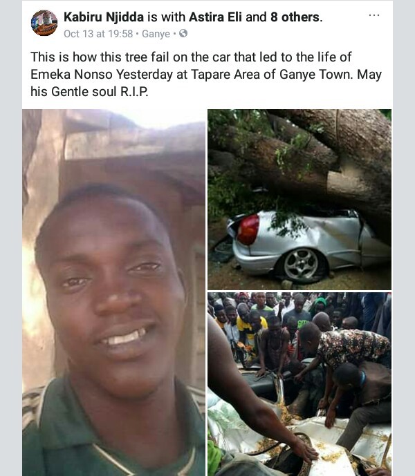 “Wind storm claim one life in Tappare Area of Ganye LG this evening, The casualty a mechanic Popularly know as NONSO made with his dead when the heavy wind storm started and he ran into a car parked under a tree at his Garage which unfortunately a heavy windstorm started with rain and off rooted the tree which fail on the car that Nonso was inside.