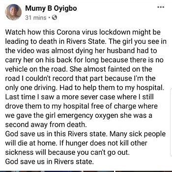 A Good Samaritan who saw a husband carrying his sick wife as he trekked the long distance to the hospital due to the lockdown in the state was moved to help transport the couple to the hospital.