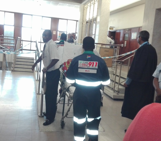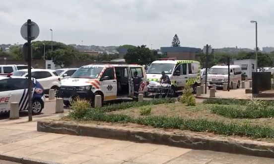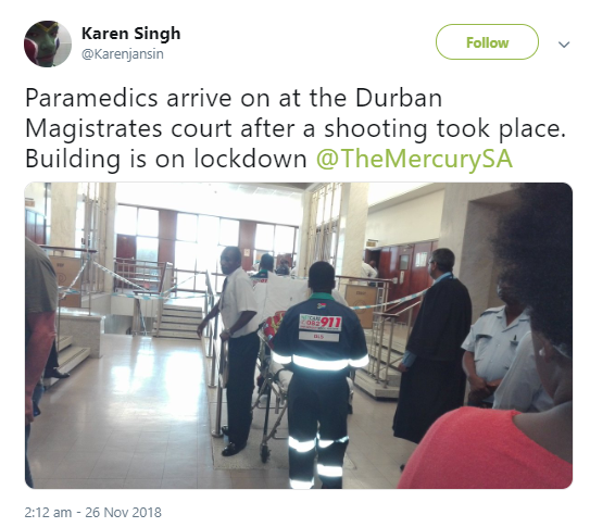 Video from the scene shows police cars and ambulances lining up outside Durban Magistrates’ Court following the shooting. The building was placed on lock down as it was stormed by armed police.