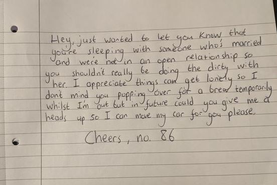The Husband addressed his letter to the “other” man and said: “Hey, just wanted to let you know that you’re sleeping with someone who’s married and we’re not in an open relationship so you shouldn’t really be doing the dirty with her.