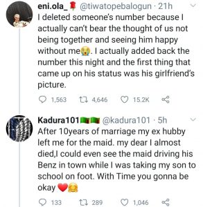 She wrote: “After 10years of marriage my ex hubby left me for the maid. my dear I almost died, I could even see the maid driving his Benz in town while I was taking my son to school on foot. With Time you gonna be okay.”