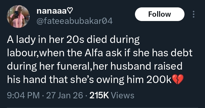 According to a post shared by a lady on X (formerly Twitter), the controversy began during the woman’s Islamic funeral rites when the Alfa asked if the deceased had any outstanding debts.