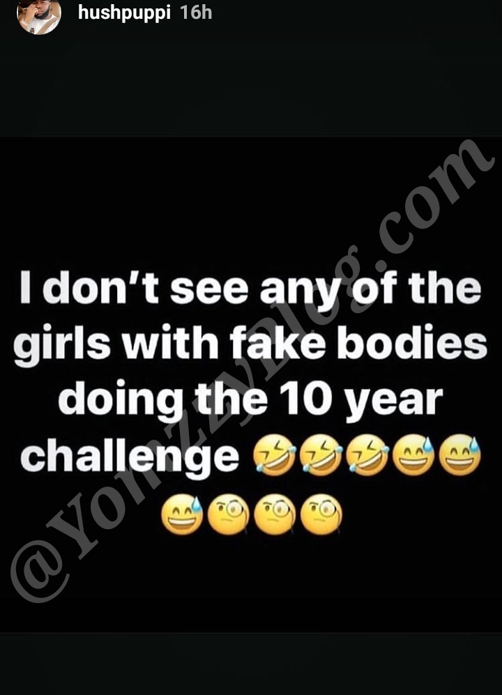 Nigerian Dubai based big boy, Hushpuppi, took to his Insta-story to throw shade at ladies with ‘fake’ bodies who couldn’t join in on the trending “10 year challenge” saying they couldn’t post any of their photos.