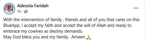 “With the intervention of family, friends and all of you that cares on this BlueApp, I accept my faith and accept the will of Allah and I ‘m ready to embrace my co-wives as destiny demands. May God bless you and my family. Ameen,” she wrote.